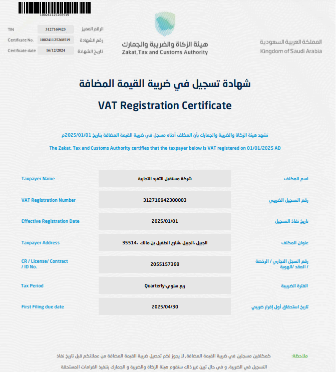 السجل التجاري: 2055157368، الرقم الضريبي: 312716942300003.