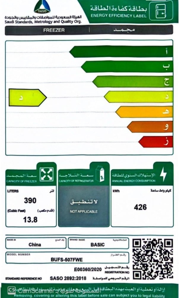 فريزر رأسي بيسك 13.8 قدم، 390 لتر ابيض
