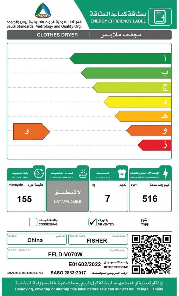 Fisher Dryer 7 kg, Air Vinted, White